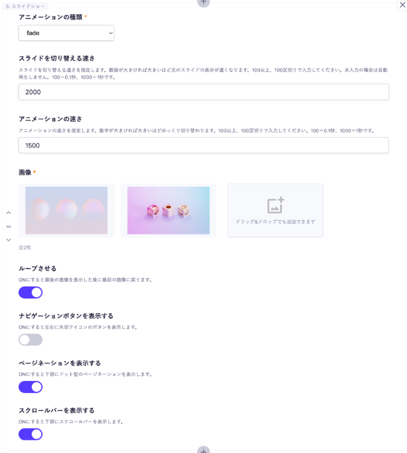 アニメーション周りでアニメーションの種類、スライドを切り替える速さ、アニメーションの速さの設定が可能で、あとはナビゲーションボタンやページネーションなどを表示するかどうかの設定ができます。