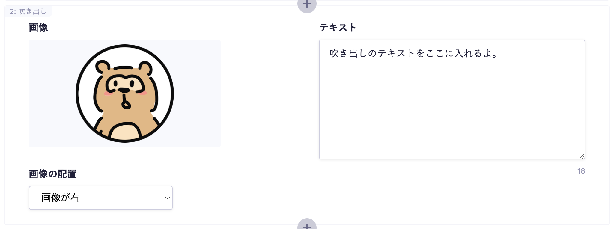 設定項目はアイコンとなる画像と吹き出しに入るテキスト、アイコンを右と左どちらに配置するかの選択肢です。