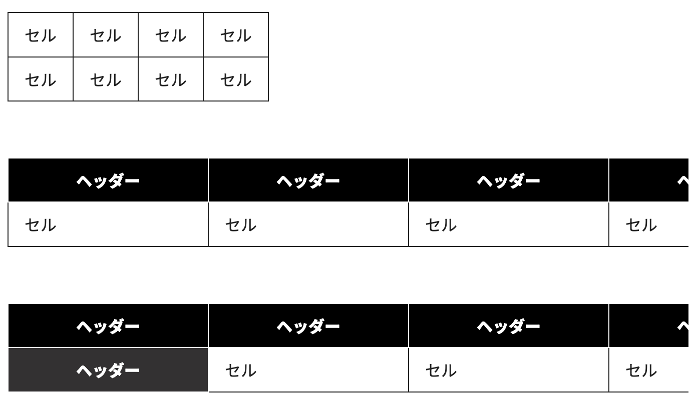 ヘッダーなし、ヘッダーあり、ヘッダー+1列目ヘッダー(複合表)に対応しています。