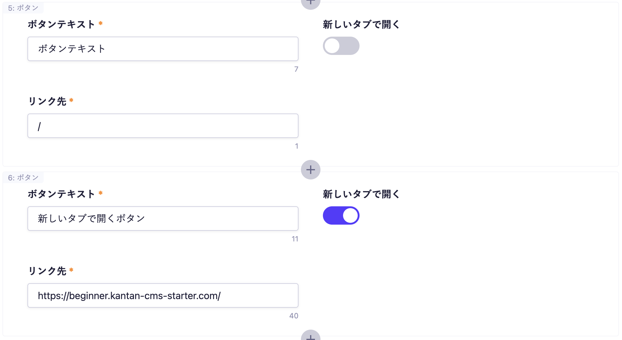 設定項目はシンプルでボタンテキストとリンク先を入力して、新しいタブで開くかどうかを決めるだけです。